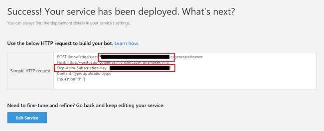 - Our QnA Bot Service will be deployed successfully. It will show the sample HTTP request with knowledge based id and subscription key.