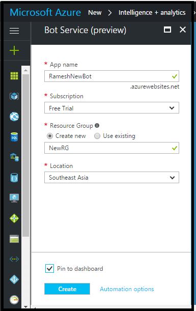 - Give unique name for Bot in “App Name” field and create new “Resource Group”. Click on "Create" button.