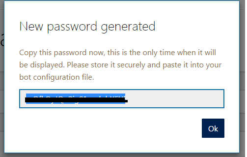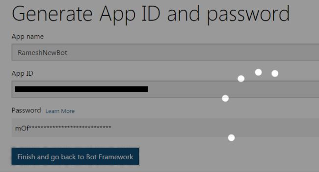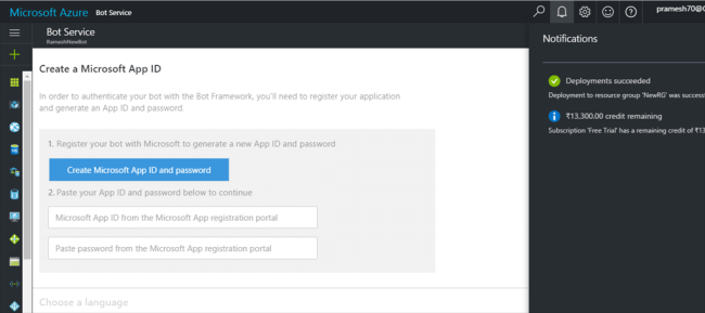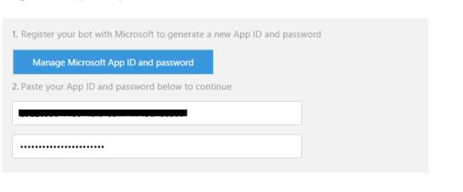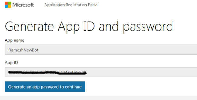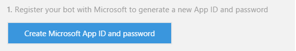 - To create App ID and password, click “Create Microsoft App ID and password” button to register your bot service with Microsoft.