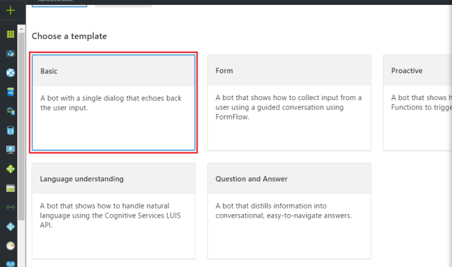 - Select the template type of your Bot service. In this example, I have selected “Basic” for my bot service.