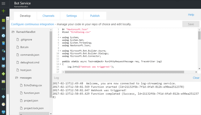 - After the Bot service generates your basic bot, the Microsoft Azure editor will contain your bot’s source files and we can modify the source code and save the changes.