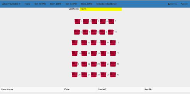 - The screenshot, shown above, is a sample form for BookMySeat Application.Y ou can book your seat for the specific slot. You can cancel your seat also from the given slot.