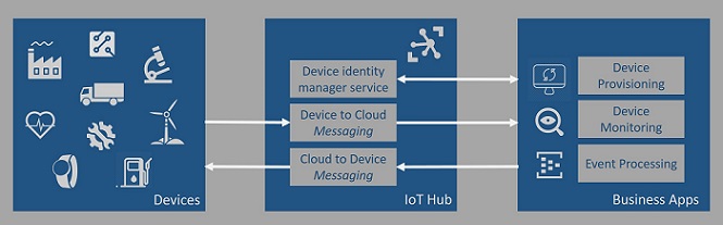 It is a central message hub which facilitates communication between IoT devices and applications. It supports secure and bi-directional communication. Other than messaging, devices can upload files to IoT Hub, using Azure Storage containers. Applications built on top of the IoT Hub can also call direct methods on devices and track device connection events.