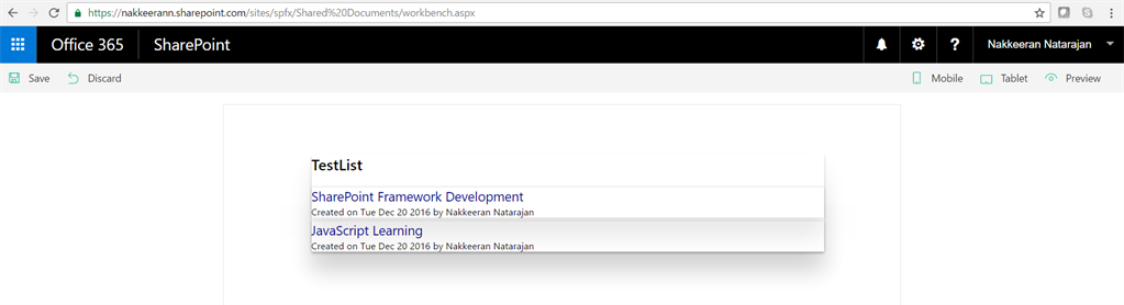 Next, let us check the functionality on workbench file. The workbench file is available on the layouts folder of any SharePoint online site. (https://siteurl/_layouts/15/workbench.aspx)