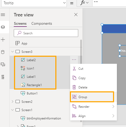 Step 4 - Group all dialog control into one, Select all controls that you want to group and click on three dots > Select Group