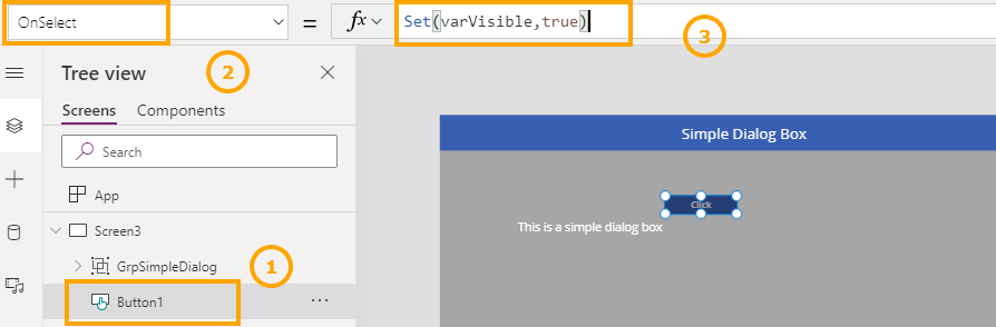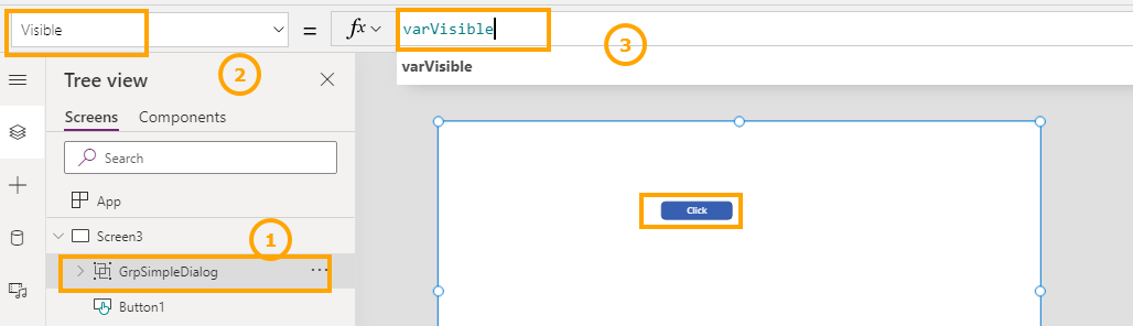 Step 5 - Select button and on OnSelect property set varVisible property to true