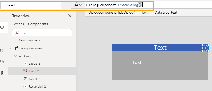 Step 35 - Now OnSelect of Icon to ComponentName.HideDialog