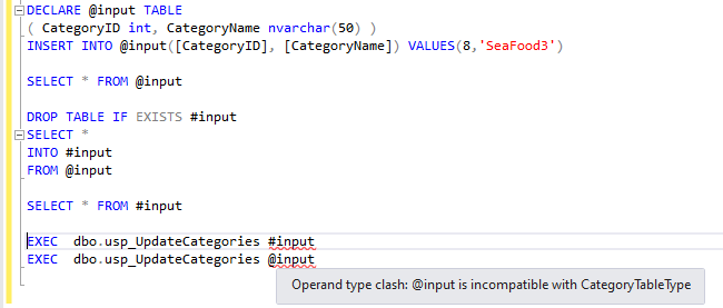 DECLARE @tvpUpdateCategories AS dbo.CategoryTableType