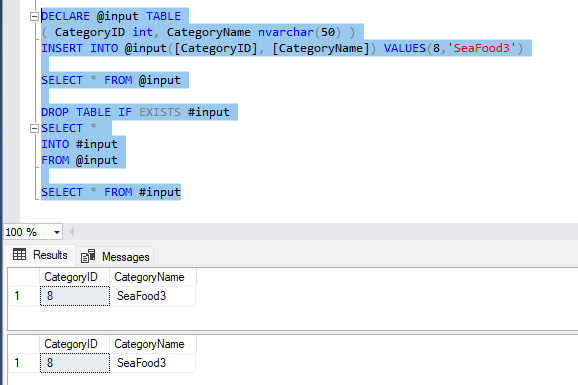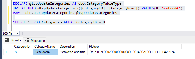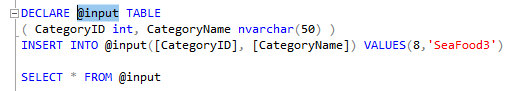 INSERT INTO @input([CategoryID], [CategoryName]) VALUES(8,'SeaFood3')