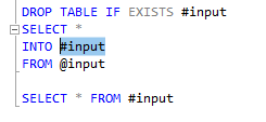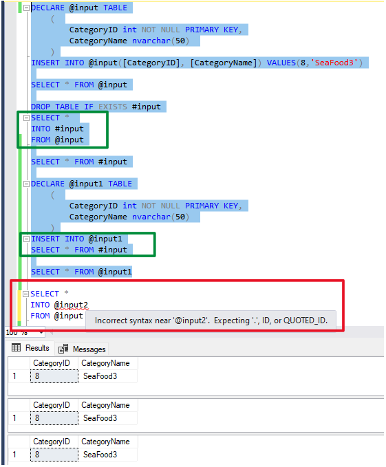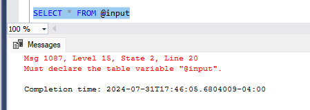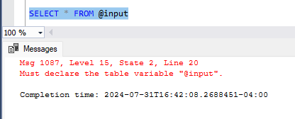 However, it does not work for Table Variable, @input, where the red frame indicated. For Table Variable, you have to Declare it first, then you can use