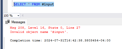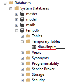 Then check the Temporary Table, we will see a temp table named dbo.#input created: