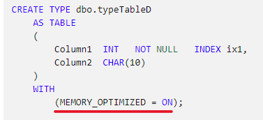 The inline syntax does not support memory-optimization. Instead, we should convert the inline syntax to the explicit syntax for the TYPE --- this is what we discussed in the article Table As Input Parameters For Stored Procedure (c-sharpcorner.com), as Table Type, or Table-Valued Parameters:
