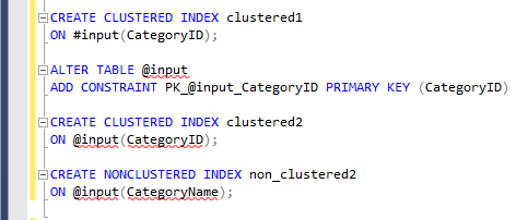 The following can be seen: Table Variable can add a Primary Key in its definition, while Temp Table can add Primary Key and Non-Clustered Indexes by ALTER (CREATE after the table is defined):