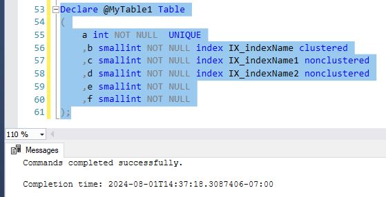 This will show add Unique constrain, clustered index, non-clustered indexes into a Table Variabel declaration:
