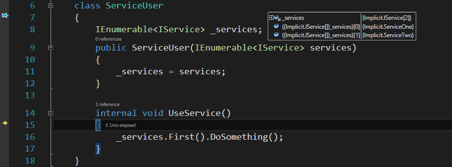 enumeration type, the DI container returns all the implementations of the same service. This is useful in cases like error loggers, where an event (an application error for instance) occurs and there are more than one loggers registered to log the event.