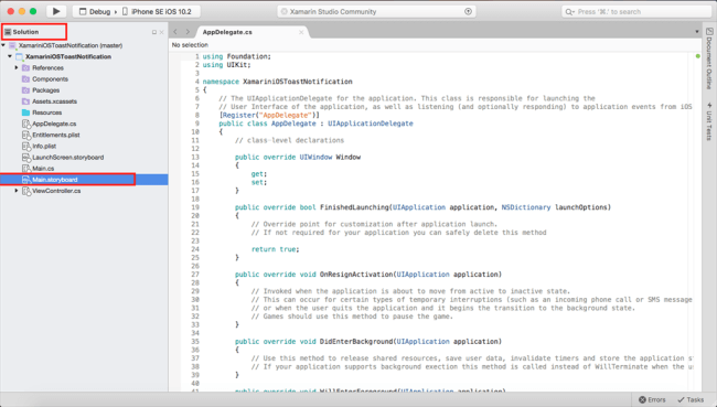 Subsequently, go to the solution. In the solution, get all the files and sources in your project. Now, select Main.storyboard and double click to open Main.storyboard page.