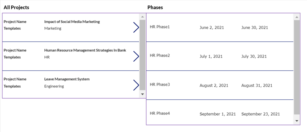 The image below displays the Project which I have created and when I select any of the Project then the right Gallery shows its phases. Like, here I have selected the second Project which Template is HR, and the right Gallery showing the HR phases.