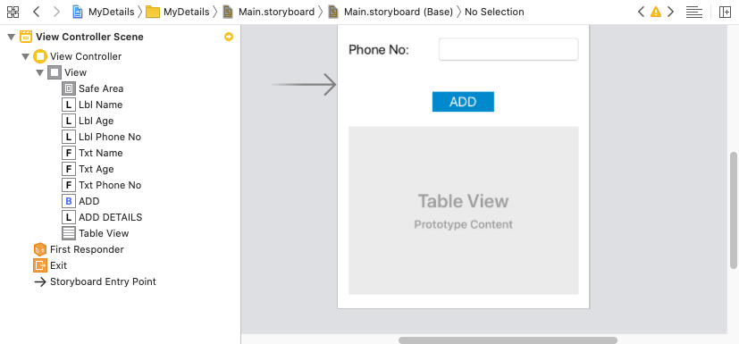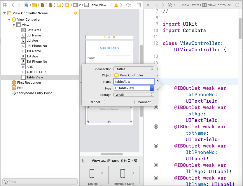 - Open the project in which you have implemented the Create/Insert operation in Xcode. In my project, I want the records inserted in the database to be displayed on a table. So, I am going to add a tableview on my UI.