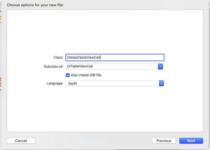 - Select UITableviewCell for SubClass of: and name your file. Also, select the checkbox 'Also create XIB File' and select the language as Swift. Click on Next and click on Create.