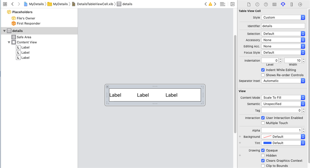 - Open the .xib file. Select the TableView Cell and assign an Identifier to this cell in its Attributes Inspector. I have assigned the Identifier as 'details'.