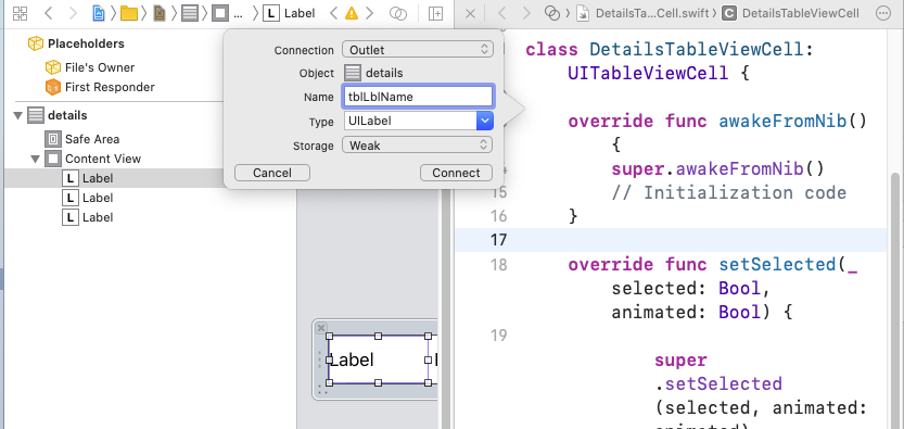 - Connect the labels to the .Swift file that you had created with this .xib file using the Assistant.