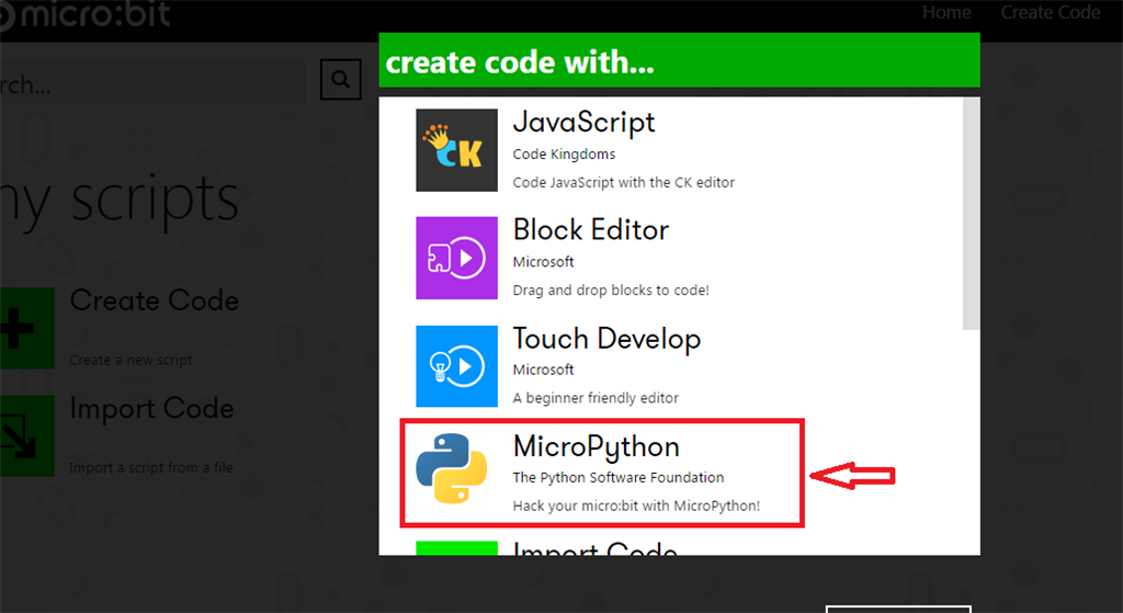 After clicking, it will ask you to choose a programming language in which you want to code for your micro: bit, like JavaScript, Python, Touch Develop, and Block Editor. Actually, Block and Touch Develop is the easiest method to write code for micro: bit, just by dragging and dropping the blocks as I have shown in this article. But I am going to show how to write code for micro: ibit using MicroPython. So, let's choose MicroPython.