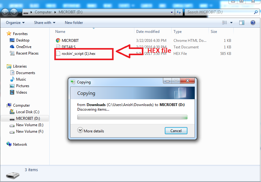 Go to your download folder and copy the downloaded Hex file in MICROBIT Drive.