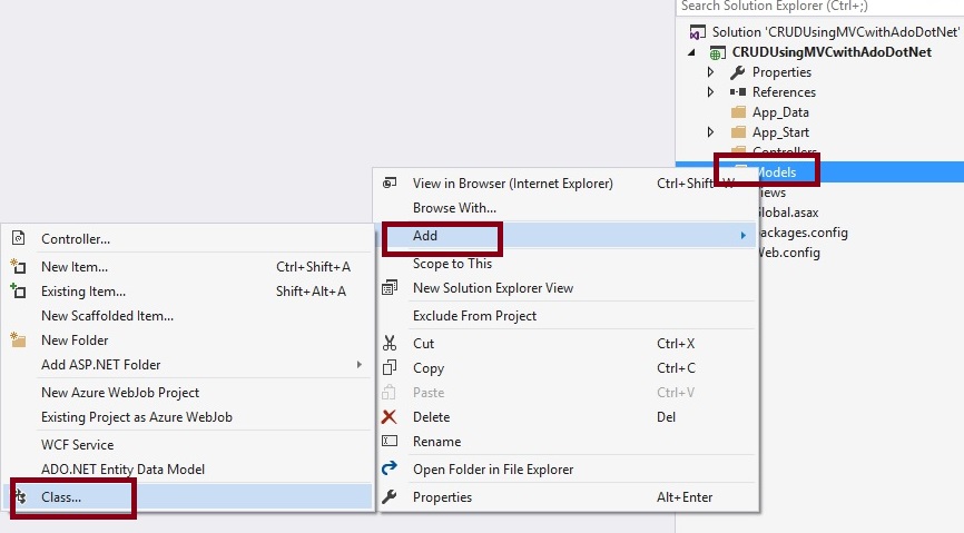 Now let us create the model class named EmpModel.cs by right clicking on model folder as in the following screenshot: