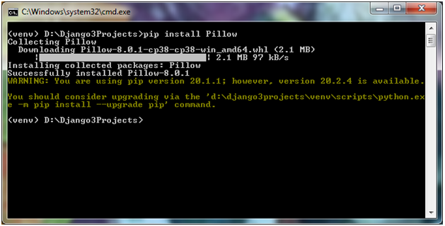 To manage images(Image Upload etc) Pillow module has to be installed. Pillow is built on top of PIL (Python Image Library). PIL is one of the important modules for image processing in Python Type pip install Pillow at command prompt and press enter to execute it as shown below.