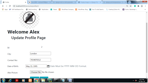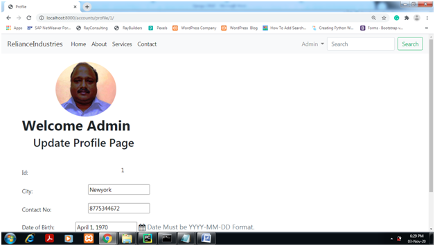 Click on the profile menu item of the dropdown menu for Admin Link. As shown below. Fill up the Blank Fields,upload profile picture and Choose a date from the date picker for the ‘Date of Birth’ field. Click the Update button.