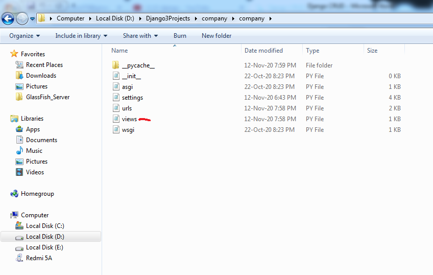 Open the django3 folder. A new folder named company is created as a project folder. Change it into the company folder created in the last step (type cd company at the command prompt)