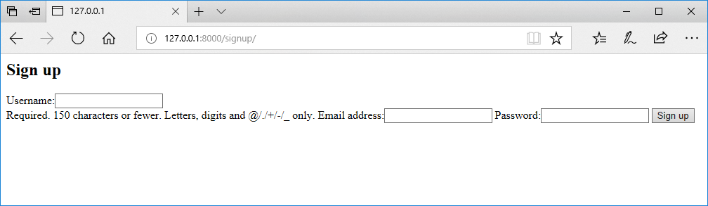 Now start your web server and navigate to http://127.0.0.1:8000/signup/ and you should see the sign up page that you created.