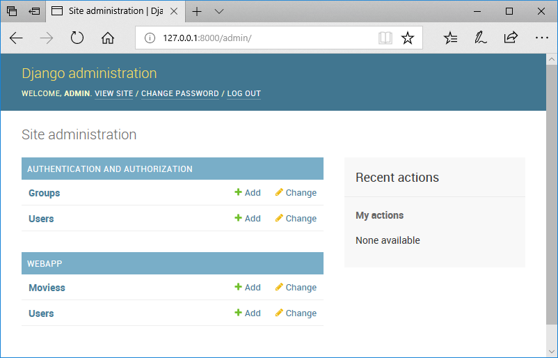 Now try accessing the admin panel again at 127.0.0.1:8000/admin/ and login using the credentials you set. You should see your models (User, Movies) under webapp.
