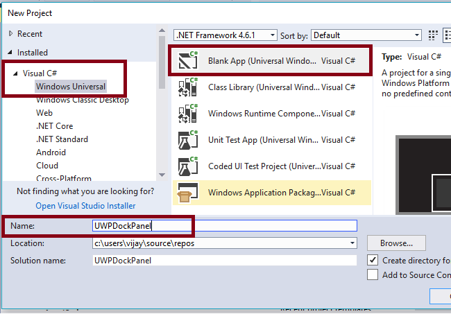 Open Visual studio 2017 -> Start -> New Project -> Windows Universal (under Visual C#) -> Blank App(Universal Windows) -> Give a suitable name for your App (UWPDockPanel) -> OK.