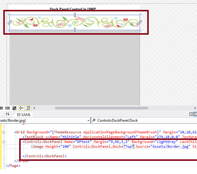 For DockPanel Top, add image control and set the height, source, and DockPanel.Dock properties.