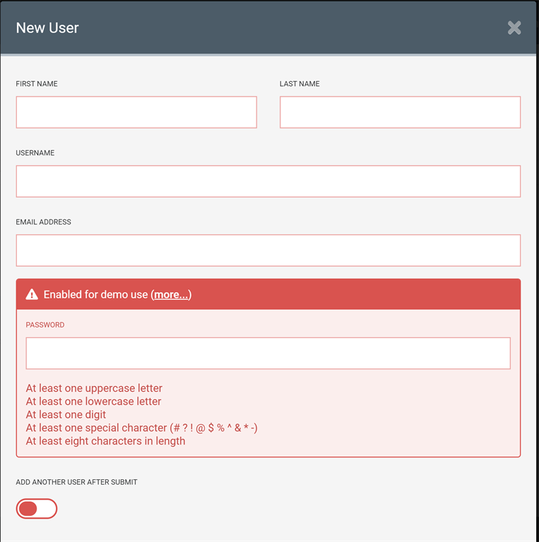 - Open Users page and click on Add User button then fill the New User form where you define your user and his login credentials.