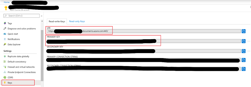 On the left side menu, click on Keys. From the read-write keys tab, copy URI and Primary Key values and keep it.