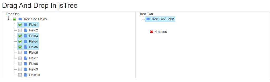 From the above code and image, you can see that we have created two jstrees. TreeOne & TreeTwo and enabled checkbox plugin for TreeOne. This is the basic load before we get into drag & drop.