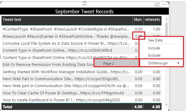 Suppose I have a Twitter analytics report and when I right click on Twitter text or likes or retweets it should redirect me to my page 2 report.
