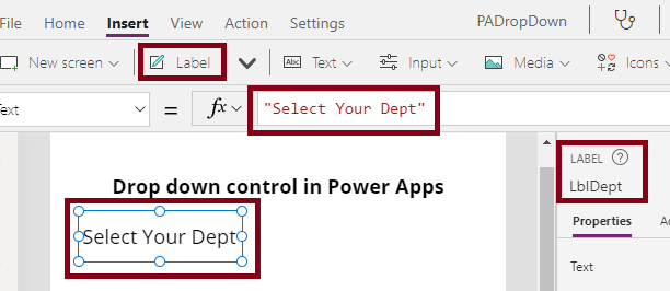 Insert the Label Control and set the Name property as LblName and Text Property as Dropdown Control in Power Apps.