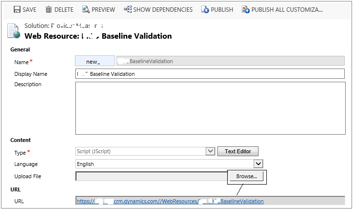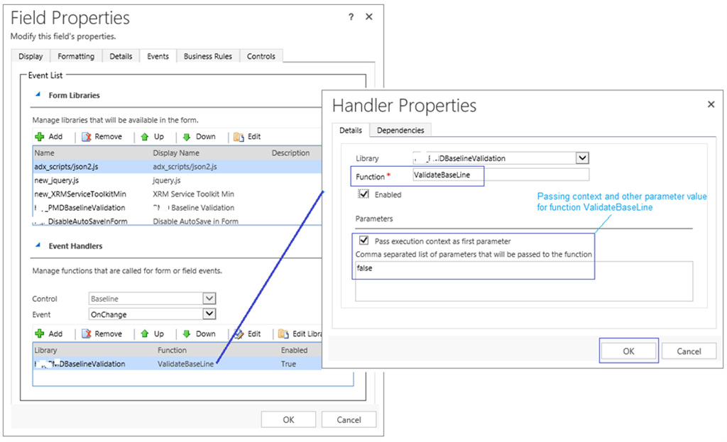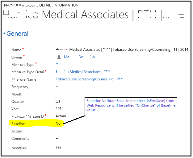 JavaScript function ValidateBaseline given below accepts few parameters (context, isFrmSave), which are passed from an Entity Form, “OnChange” of BaseLine field (“Two Option Set”). The same ValidateBaseLine function is also called in Form OnSave event also. The value of the parameter isFrmSave is set as true in this case.