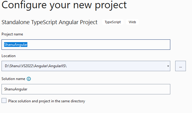 Enter the project name and make sure the project is under the Angular Standalone Solutions and click Next.