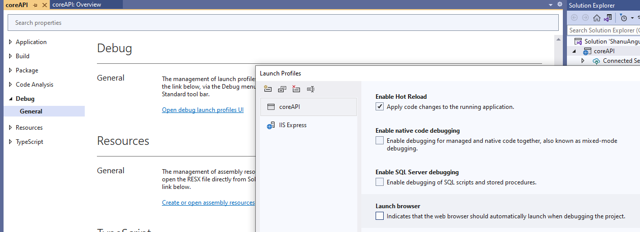 As we have both our Angular and WEB API project solutions in same solutions, we do not need to open two browsers for Angular and WEB API. Our need is as our WEB API needs to be run in background and perform CRUD operations and some business operation in WEB API and all the data display and controls will be done from our UI Part in Angular project. So now, we disable the Launch Browser options for the WEB API Project.
