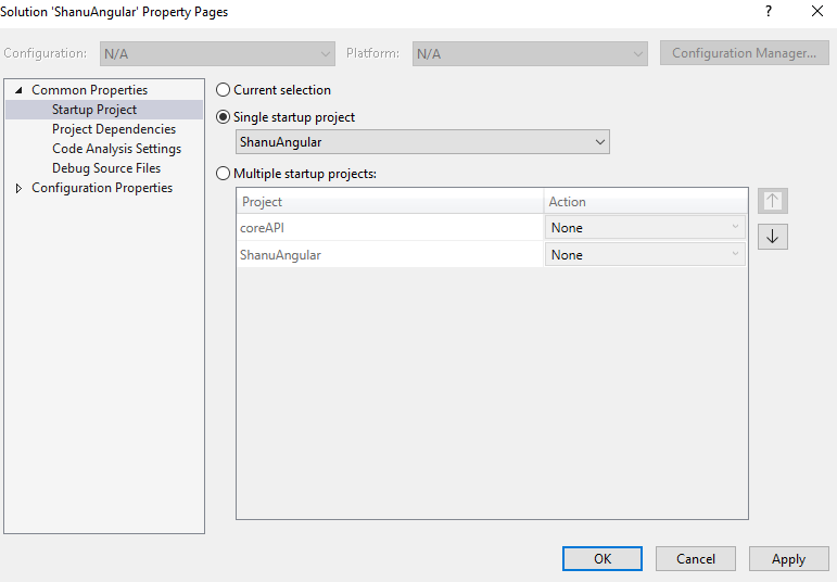 Now we need to make both our Angular and ASP.NET Core WEB API Project run, also we need to make the startup project to start initially. Here first we need to run the WEB API project and followed by that our Angular Project . for making this.