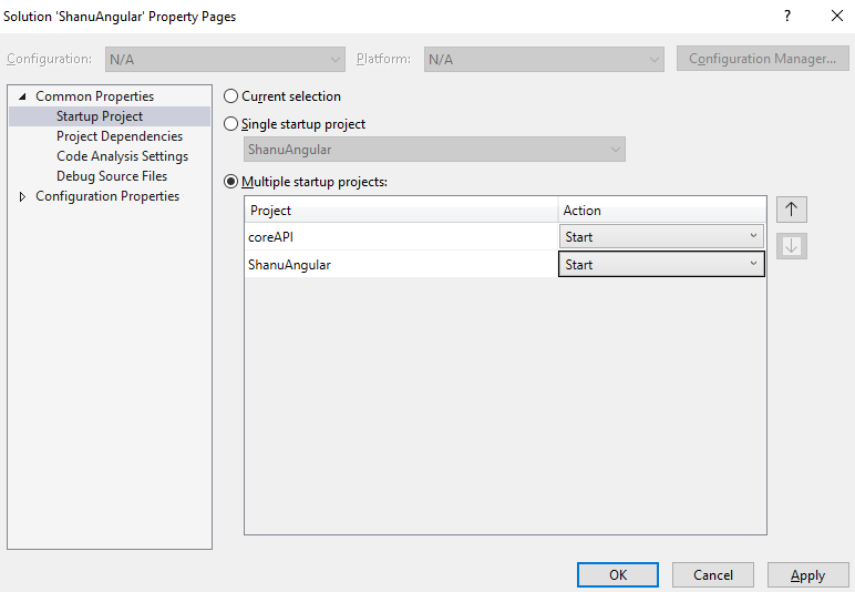 In order to run both our Angular and ASP.NET Core project we need to select the Multiple startup projects and select the action of each project as start. Make sure as your ASP,NET Core WEB API as top of Angular project as if we want to bind the ASP.NET Core results in Angular then we need to run first our WEB API project and then Angular project.