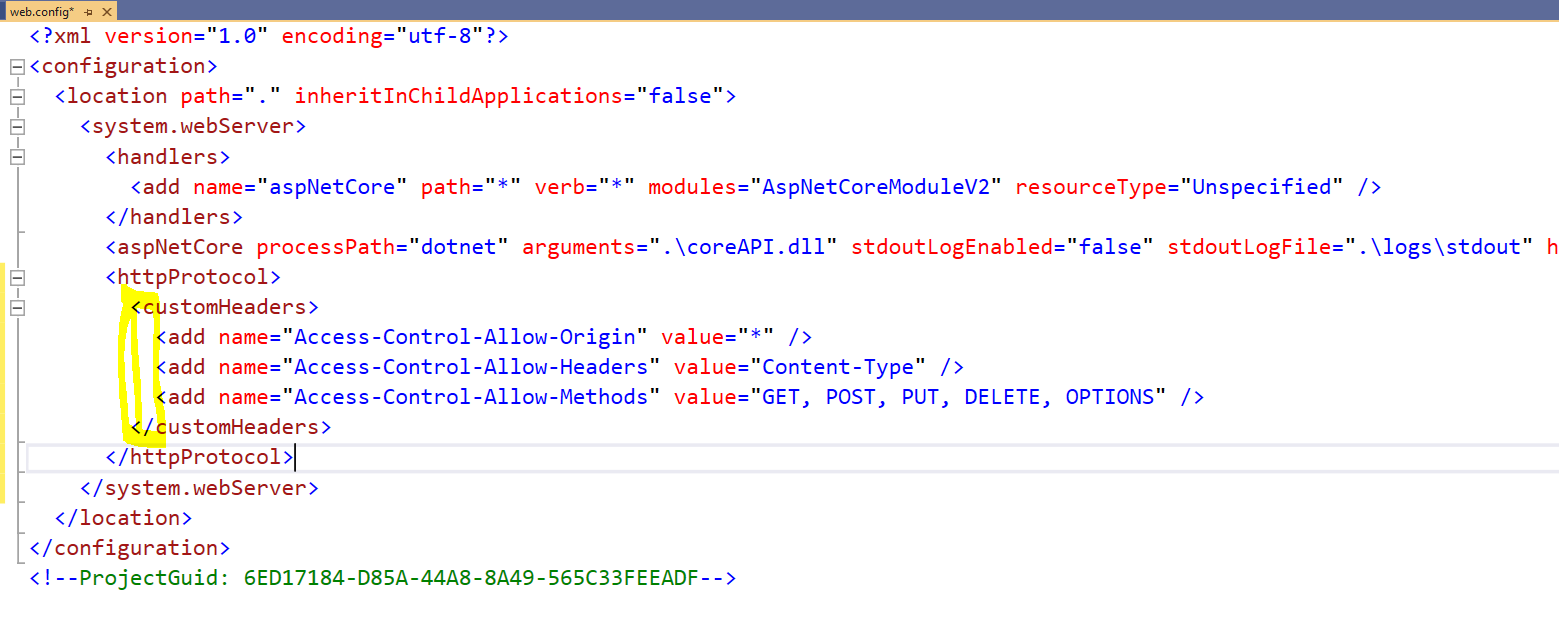 Now we can open the web.config will and add the below code to allow cross origin for accessing our WEB API to be used in our Angular Application.