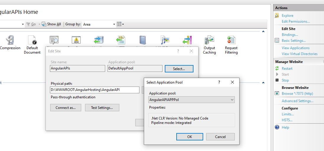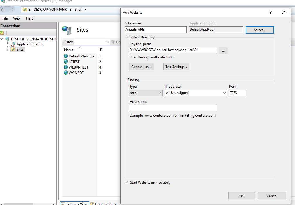 Follow the same method as we used to publish the WEB API and now, we create a new website and add the path with the Angular project and test it.