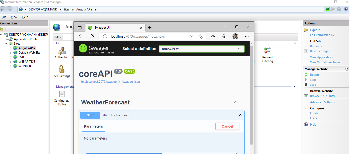 Now we can check whether our API is running under IIS or not to check it from the Right Side >Click on Browse and we can see our API is running to test the swagger enter the /swagger and test it.