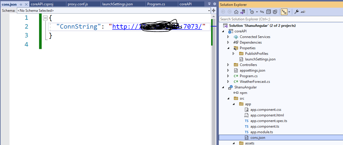Now open the app.component file and first import the cons.json file ad next declare the variable as coons and assign the JSON data. In the http get method we add the API iis ipand port address to get and bind the data.
