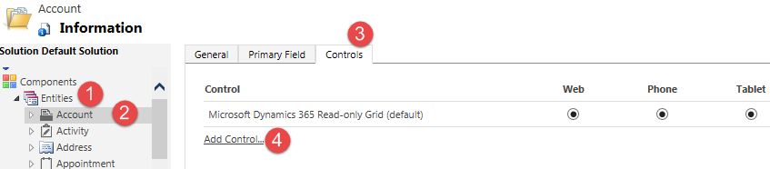- Expand Entities node under solution components and select Account entity->Controls-> Add Control.
